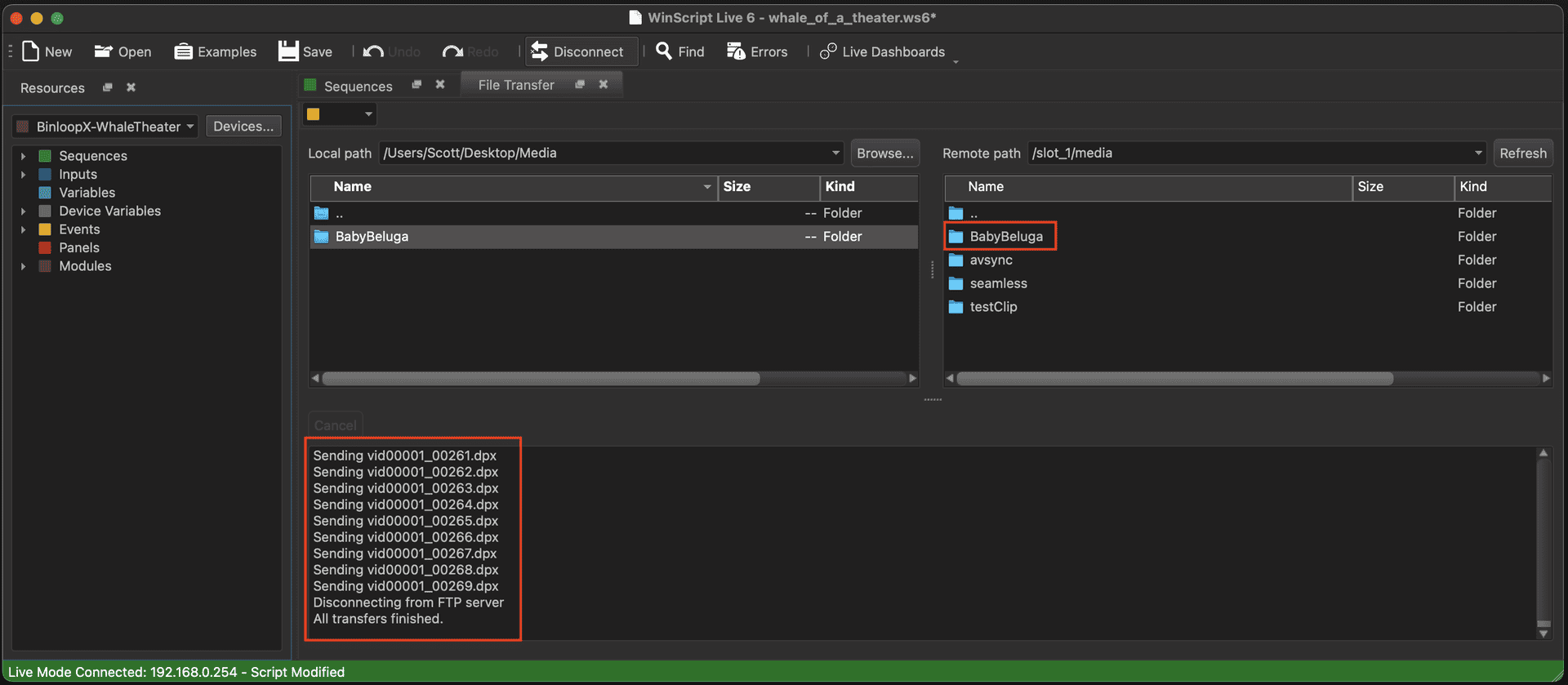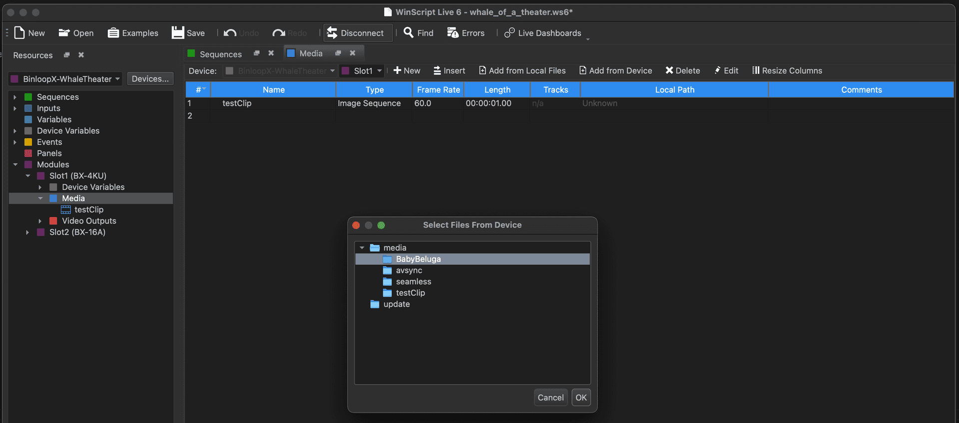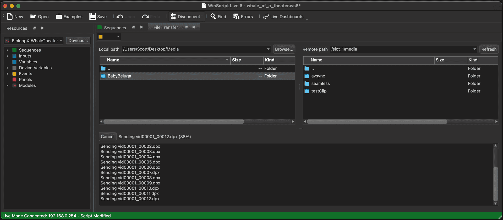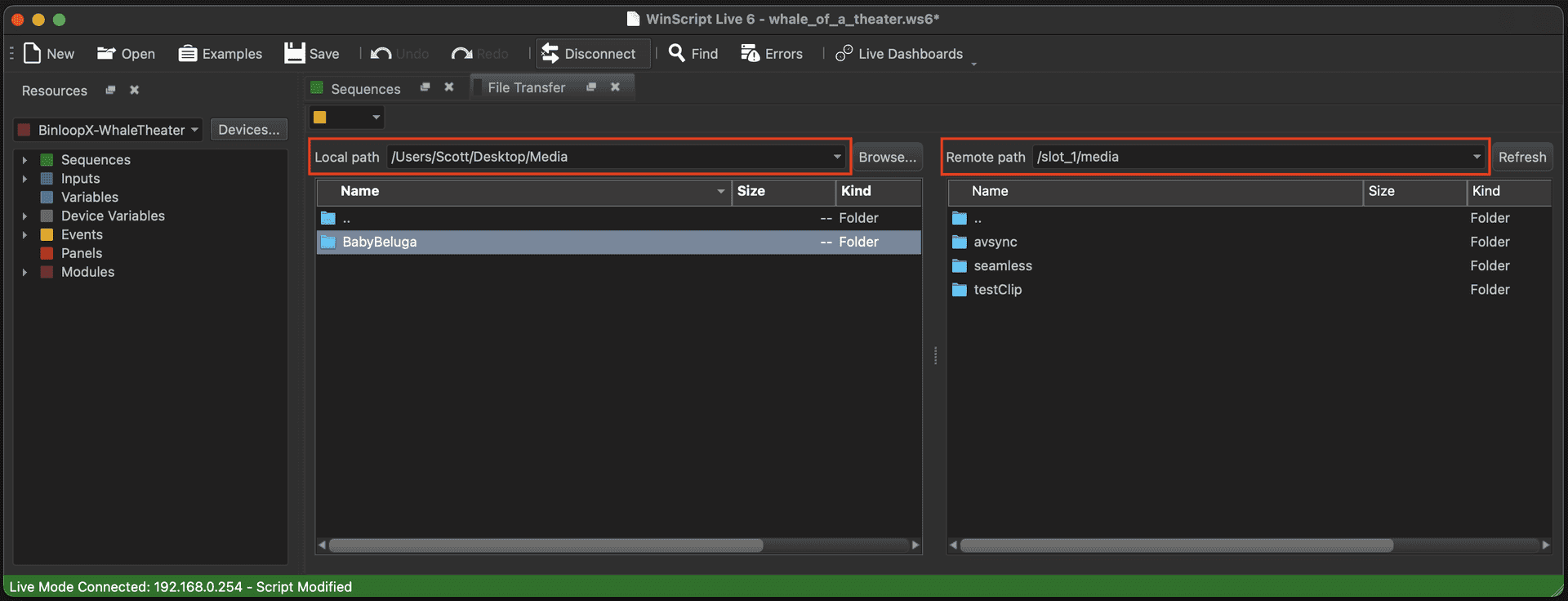 Aside from the ability to configure and program the BinloopX, WinScript Live also has the ability to manage and transfer content to the BinloopX modules via Ethernet. This transfer will occur over the main Network port on the BX-CON1 controller card or, optionally, over the Media Network port of the BX-4KU that you are transferring to. Although it requires an additional network connection, the advantage of using the Media Network port is faster transfer speeds...which can make quite a difference when you're transferring many large DPX files! WinScript will automatically check for this dedicated connection when you initiate a transfer and use it if it's available.