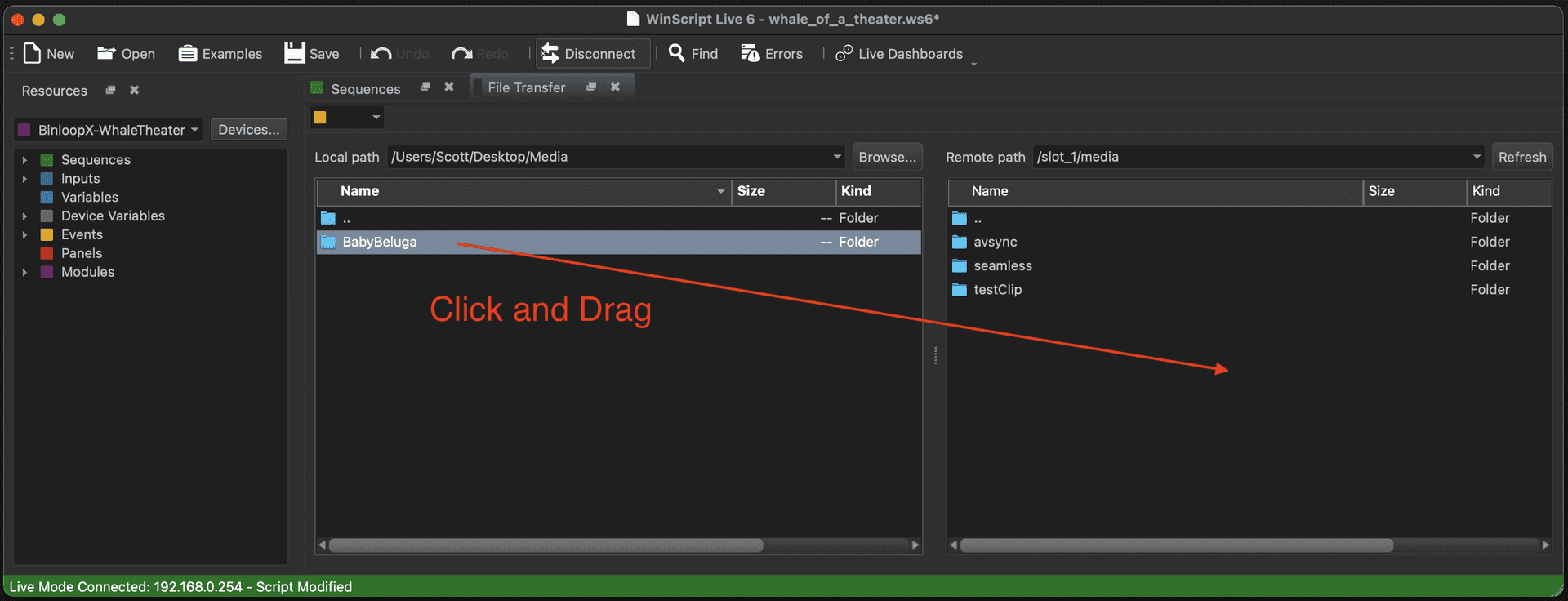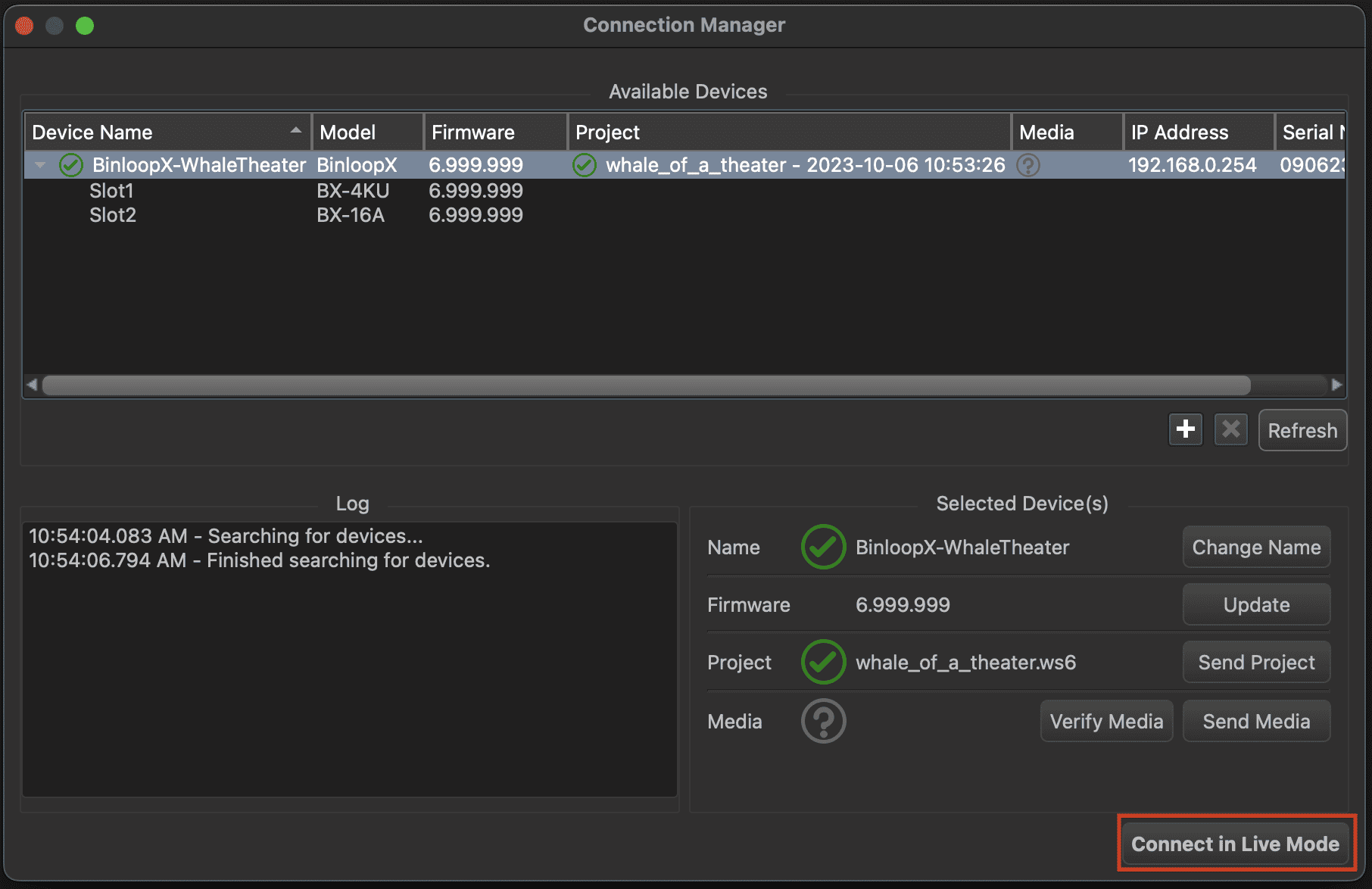 Just like WinScript Live, this transfer can occur over the main Network port on the BX-CON1 controller card or, optionally, over the Media Network port of the BX-4KU that you are transferring to. Just make sure you know the IP address of the network interface you are connecting to.