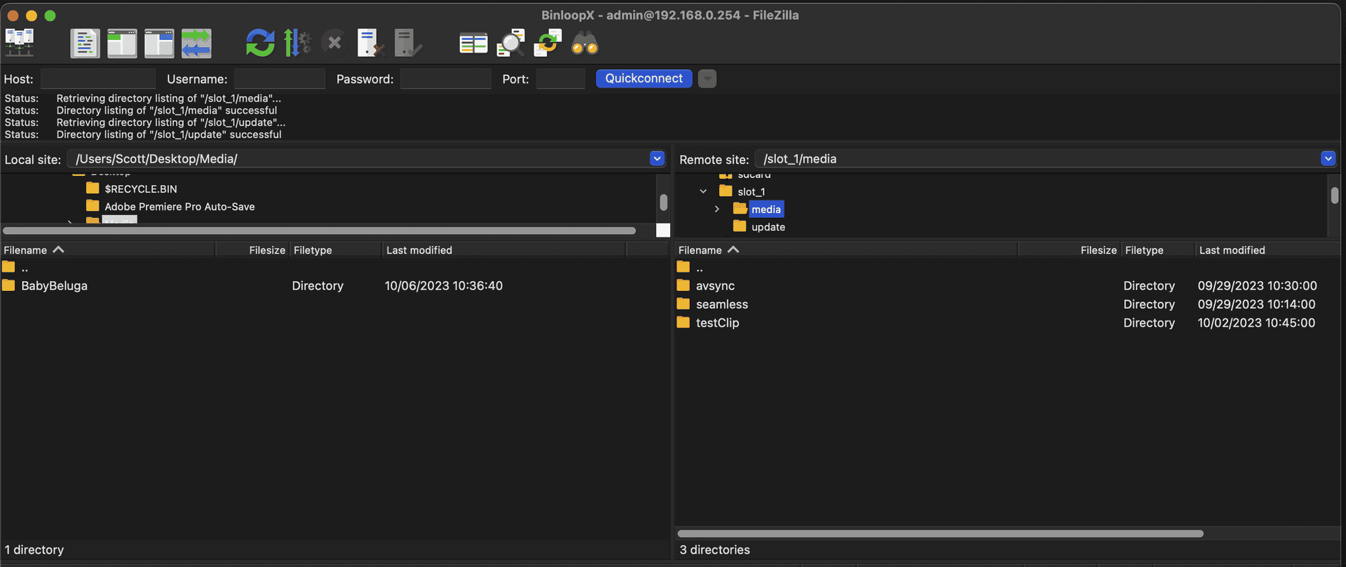 Once a connection is established, browse to the media folder of the BX-4KU you wish to transfer content to on the right side view of FileZilla. Browse to the source folder that contains the content you wish to transfer on the left side view.