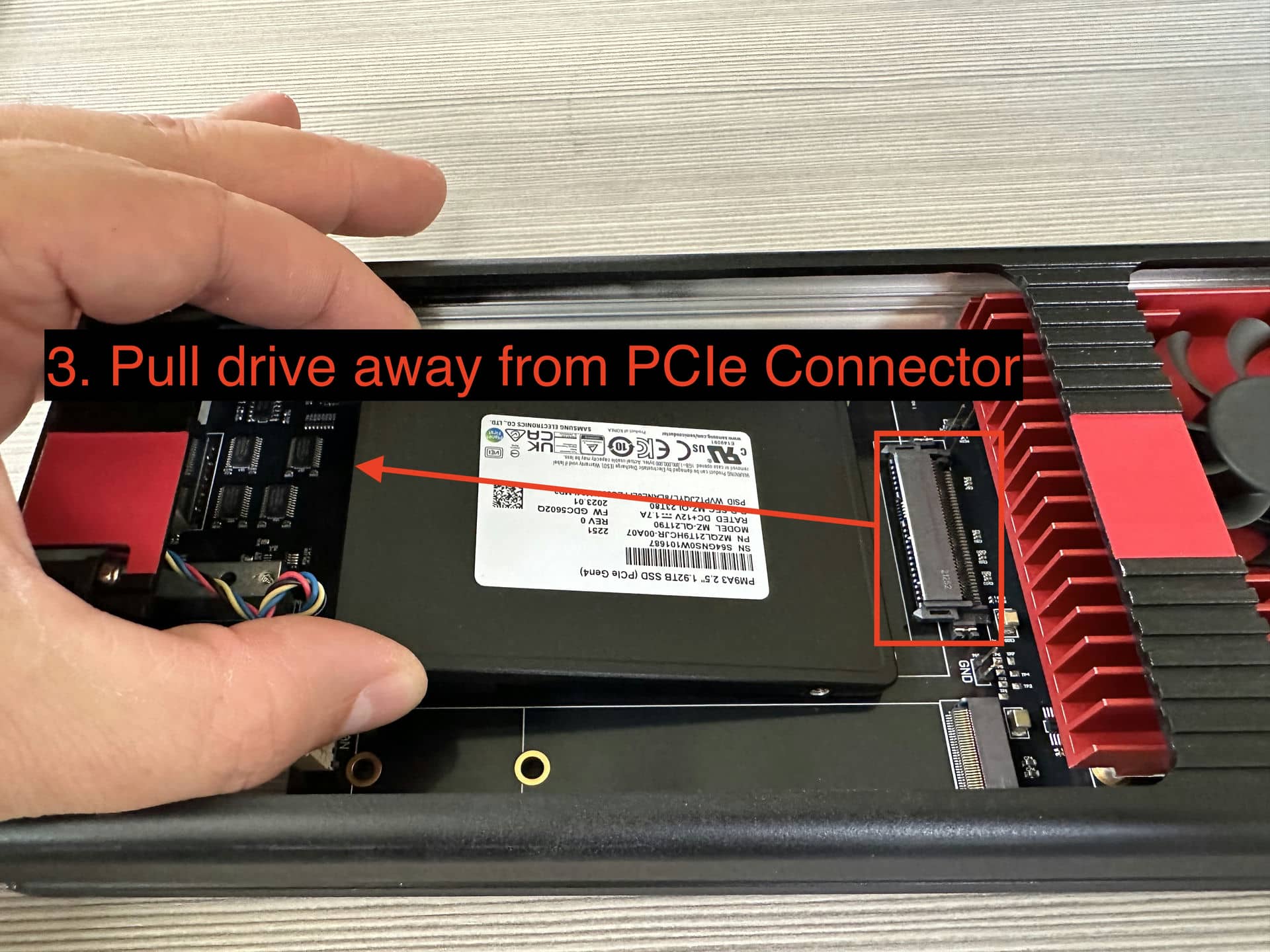 Carefully remove the SSD from the BX-4KU module by pushing back on the plastic drive clip while gently pulling up on the end of the drive that is held down by the clip (opposite end where the drive is connected). Once the drive has cleared the plastic clip, pull it away from the PCIe connector to disconnect.