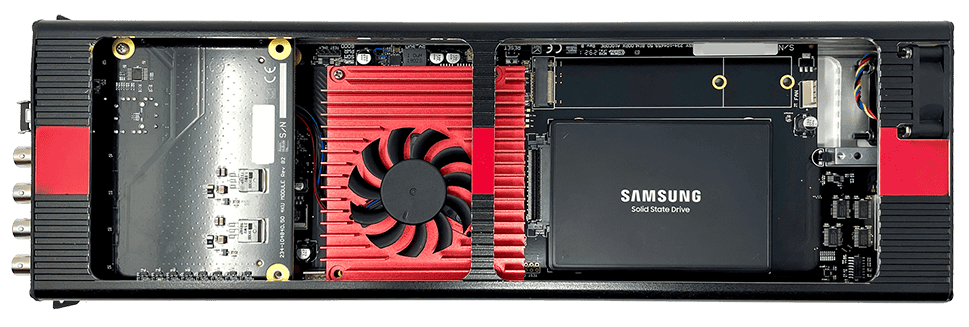 The BX-4KU video module provides phenomenal 4K60 uncompressed video playback from an incredibly compact and robust device that installs cleanly into an A/V module slot within the BinloopX. Each module provides either a single channel of 4K/UHD playback at up to 60fps, or up to four channels of 2K/HD playback. The removable internal U.2 SSD enables ultra-reliable low-latency playback of high-quality uncompressed DPX image sequences.