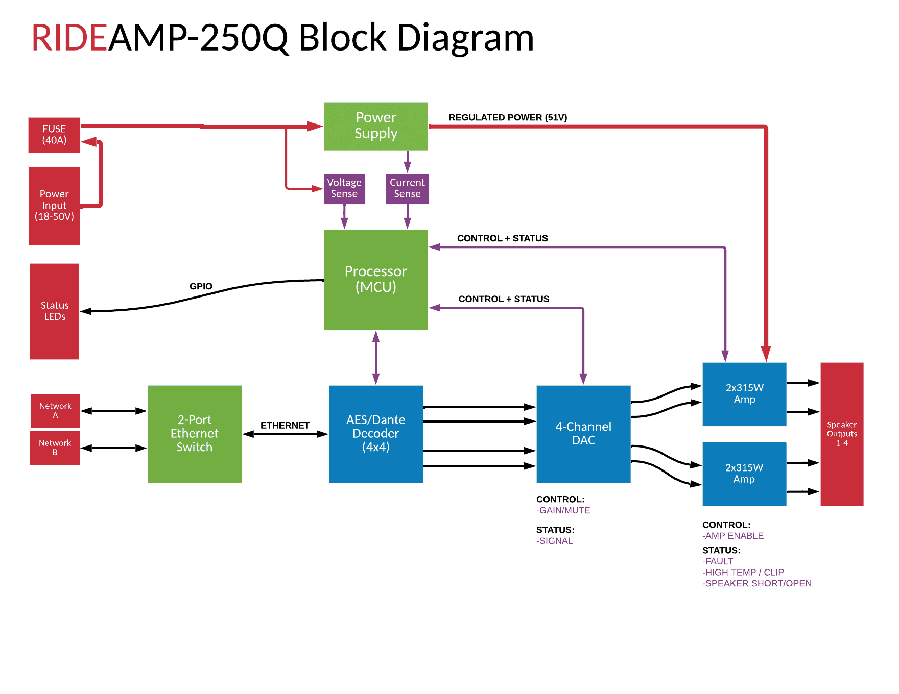 NOTE: RidePlayer, RidePlayerX, or a PC running the RideAmp Utilities software is required for Network Control/Monitoring via the audio network link.