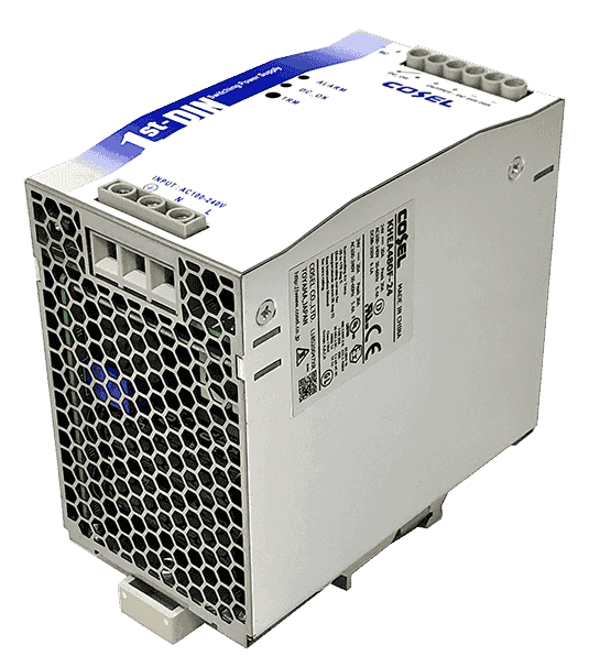 This supply is capable of providing RideAmp with a 24 VDC/20 A power source. It accepts an input between 100-240 VAC and is designed to mount on a DIN Rail alongside the RideAmp.