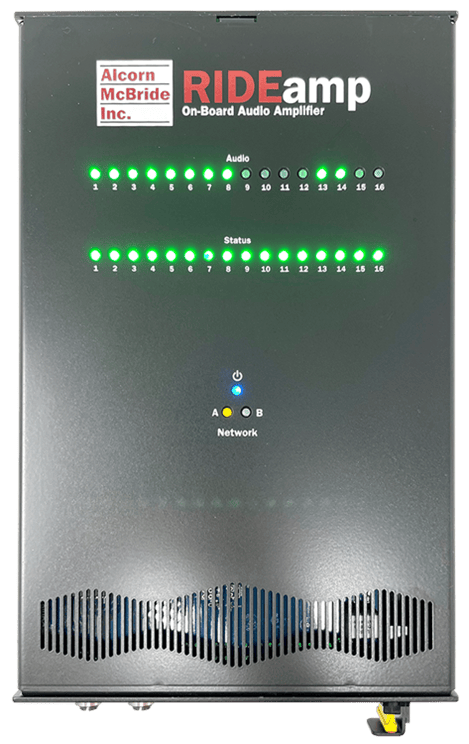 When one or more RideAmp units are paired with an Alcorn McBride RidePlayer, you have a complete solution that offers perfectly synchronized audio, DSP, high-power audio amplification, and comprehensive status monitoring of the entire on-board audio system.