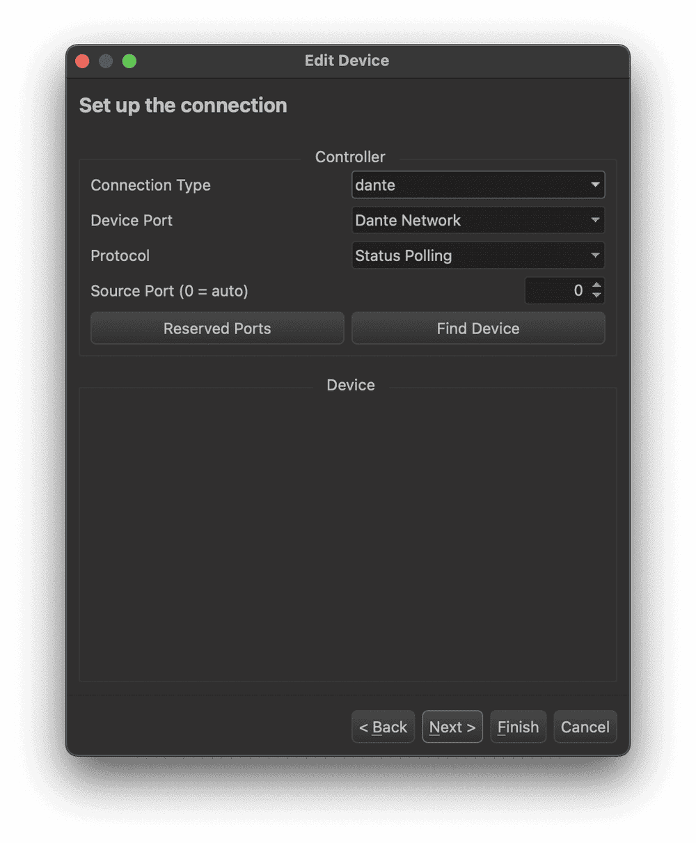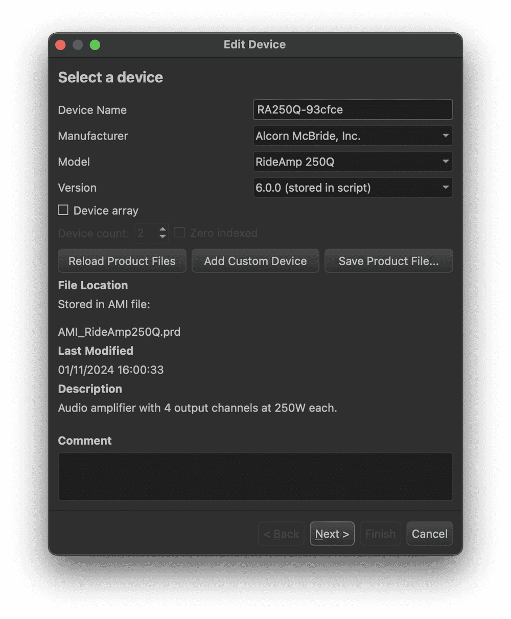 In the Devices window, add a New device, and configure it for an Alcorn RideAmp-25H or RideAmp-250Q. Make sure to name the RideAmp the same name as what was previously configured in Dante Controller.