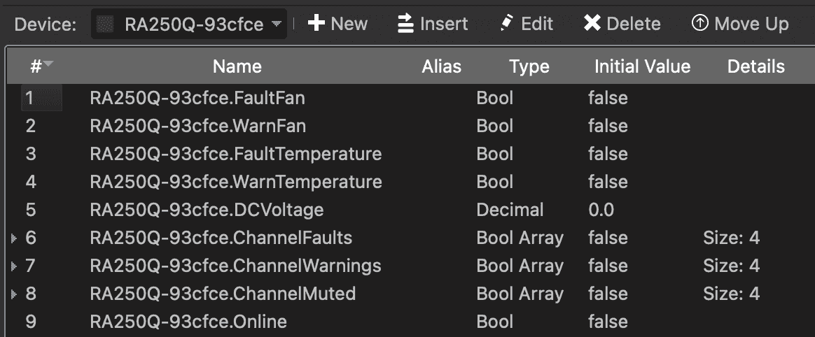 When the RideAmp is added to your RidePlayer script, Device Variables are automatically generated. These variables allow you to monitor the status of the RideAmp, specifically: