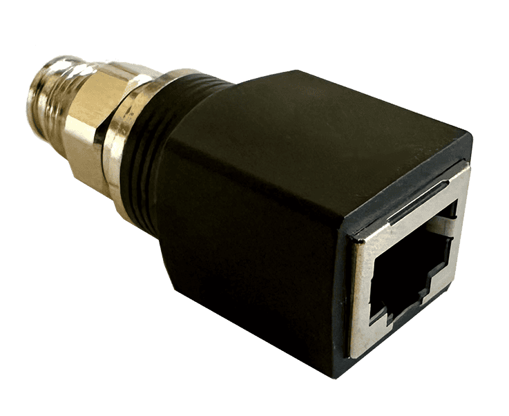 This is an adapter that converts from the M12 X-Coded connectors of RidePlayer to a standard RJ45F Ethernet connector.