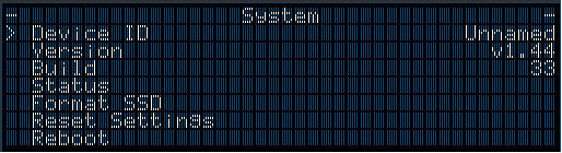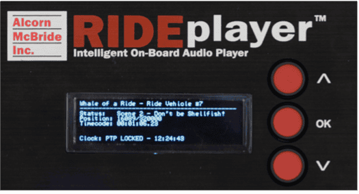 The top panel of RidePlayer features an 8-line by 42-character OLED status display. This display is primarily used to share application-specific information (i.e. “Location: Scene 2”) from the show control script. However, this display also offers a full menu system that can be accessed using the navigation buttons located adjacent to the display
