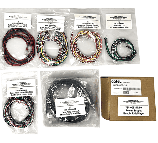 We offer this kit to enable users to quickly bench test or build mockups with RidePlayerX units. This kit includes prefabricated cables for each of the connectors on the unit. It also includes a 24V/20A DIN Rail power supply to power up the unit.