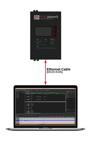 To make this connection, you’ll need an Ethernet cable with an M12 X-Code connector on at least one end. The other end can be either RJ45 or M12 depending on your computer or network switch. For convenience, the RidePlayerX Development Kit includes several M12-->RJ45 adapter cables. These cables are also available for individual purchase from Alcorn McBride. See the Accessories section for more info.