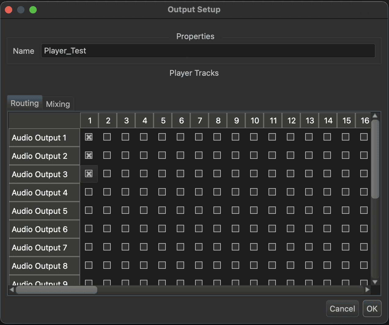 Enter Player_Test as the player's name. The matrix below represents how the tracks of any WAV file that the player plays are routed to the physical audio outputs of the RidePlayerX. For example, a mono WAV file only contains 1 track so it's routing would be determined only by the 1 column, a stereo WAV file would be routed by the 1 and 2 column, and multi-track WAVs would use anywhere between 3 to 64 tracks. The test clip that will be played from this player resource is a mono track, so let's configure this player to route Track 1 to audio outputs 1-3 like this: