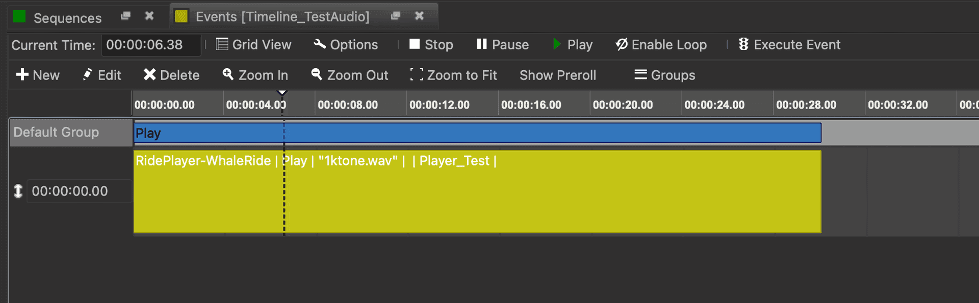 Let's learn another common way to control this sequence. Click on the Sequences tab to view the sequence list. Click on the Loop icon to the left of the sequence named Timeline_TestAudio to enable looping and then click on the Play icon. If you listen to the audio output of the RidePlayerX, you'll notice that the test clip is now looping.