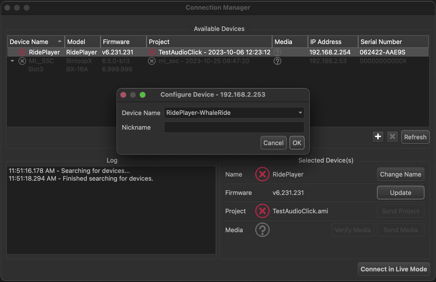 The name assigned to your project (i.e. RidePlayerX-WhaleRide) will automatically appear in the Device Name section. Click OK to assign this name to the RidePlayerX hardware.