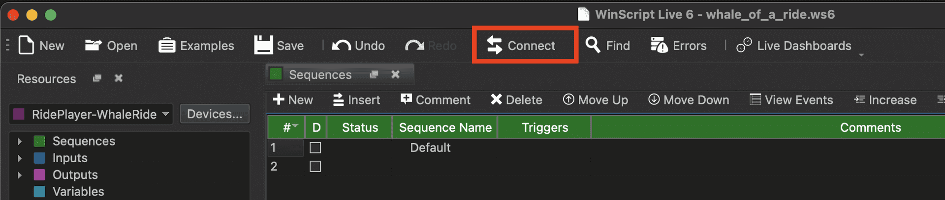 Let's start by clicking the Connect button located in the Menu bar at the top of WinScript.