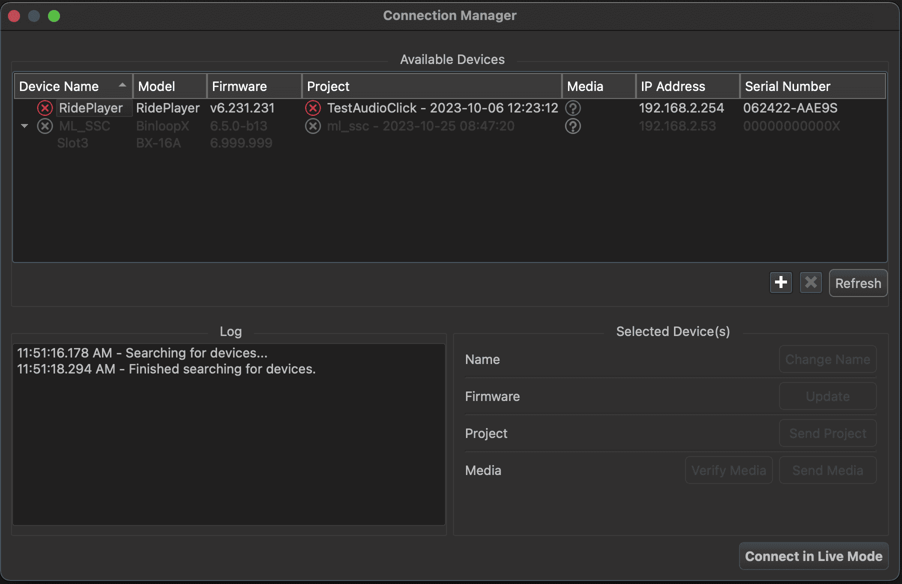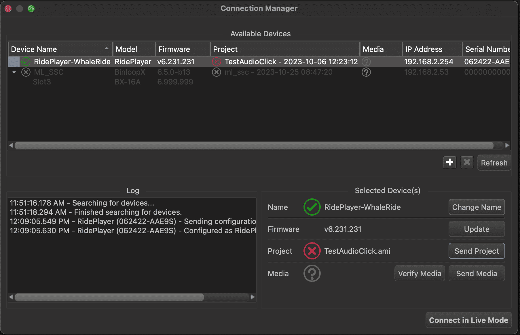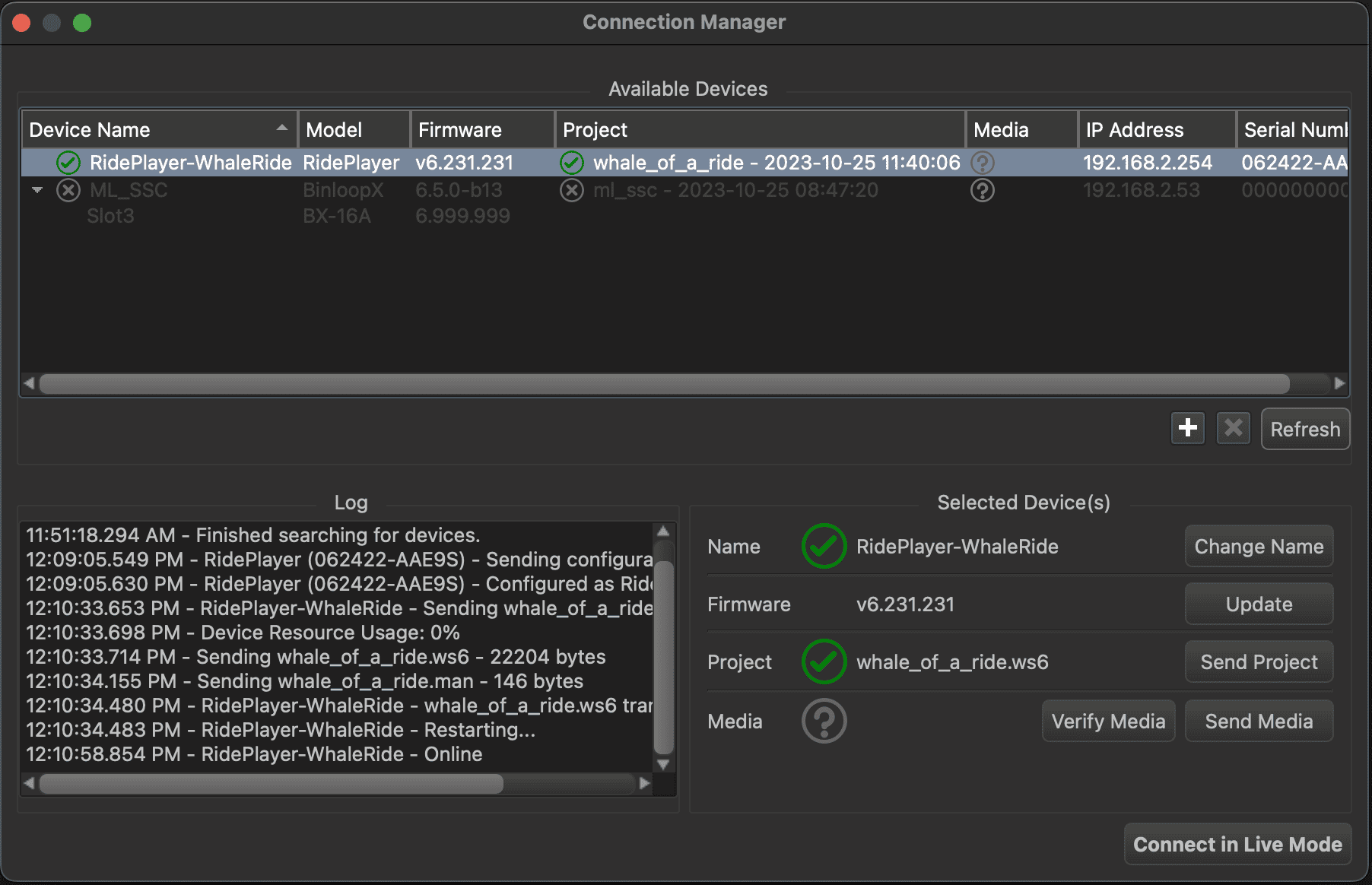 Click Connect in Live Mode to establish a live mode connection with the RidePlayerX. This will allow you to monitor and edit the RidePlayerX project in real time for the remainder of this Getting Started guide.