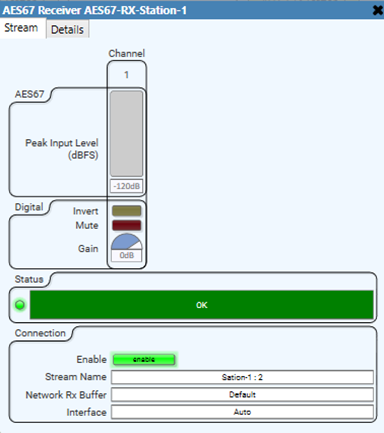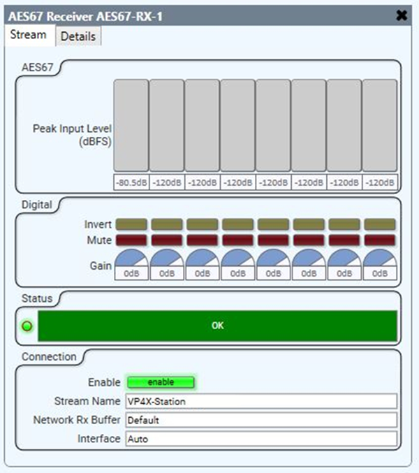 - Stream Name: this list will auto populate from the V-Pages or V-Coms in your network that are sending an AES67 stream. The stream names were set when you linked the V-Page or V-Com. Select the V-Page's audio that you want to get on that receiver.
