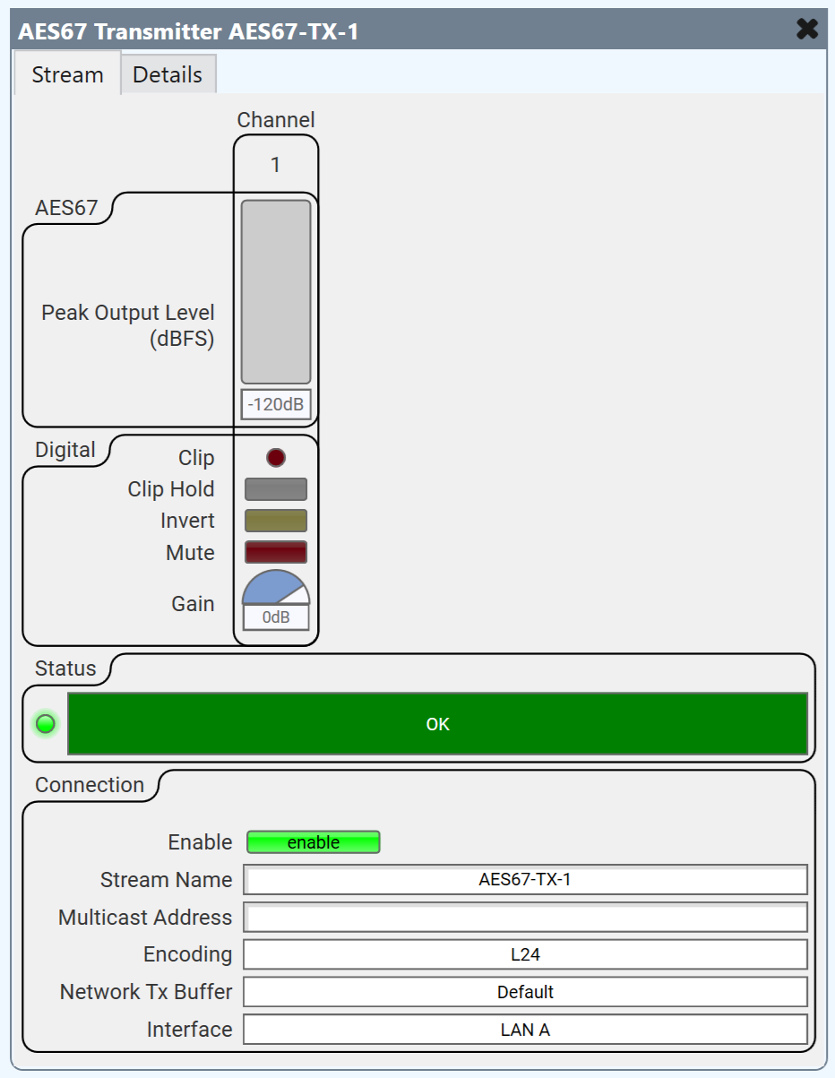 - Stream Name: A user defined name for the audio stream. This is the name that will appear on the transmitter list in Dante controller.