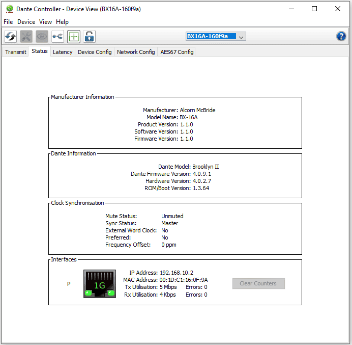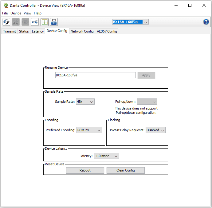 Once the network addresses are configured properly, you will have full visibility into the network audio settings of the device. Using screens like the ones shown below, you have the ability to configure things like the Device name of the module, the sample rate, and other detailed settings specific to the network audio interface.
