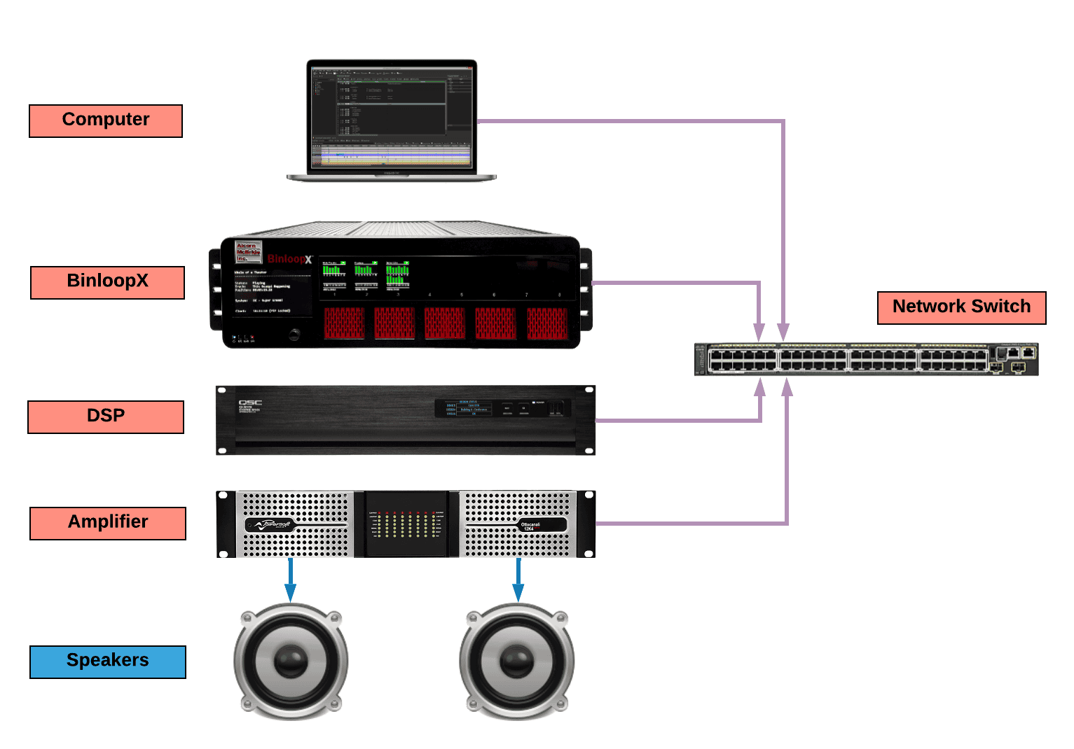 First, we have to make sure your audio network is connected properly. Audio network architecture can vary wildly, but here are some common examples using our products.