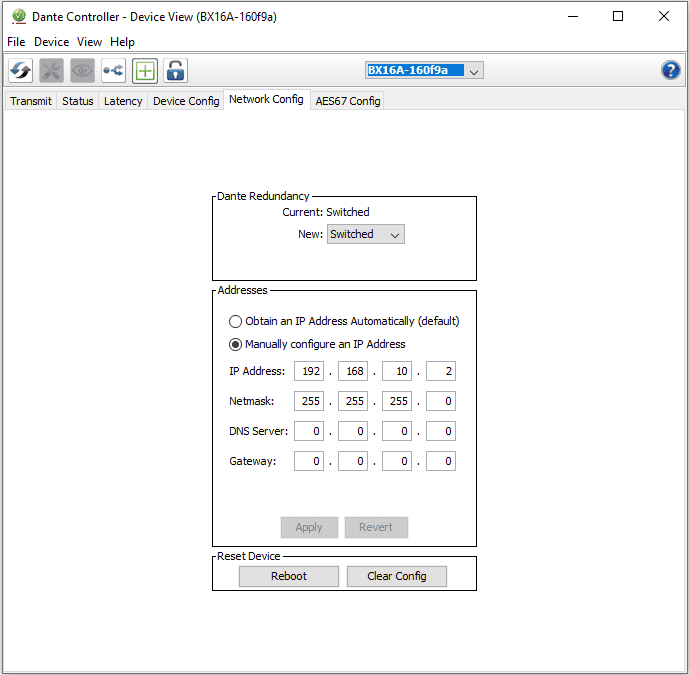 When you launch the Dante Controller software, it will be able to scan the network for network audio devices. The network addresses can be configured by selecting the device and then browsing to the Network Config tab. One you have configured these settings, be sure to click the Reboot button to ensure the new settings are applied.