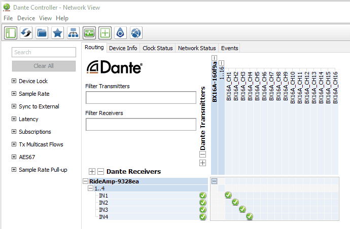 Once the basic setup is complete, routing the audio outputs of the network audio interface is a piece of cake. Simply connect the Transmitters of the source device (i.e. RidePlayer or BinloopX) to the Receivers of your destination device (i.e. RideAmp, DSP, etc.) and the audio signal will flow!