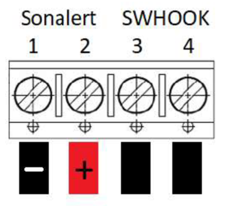 The Handset Hook sensor is a contact closure so wiring polarity is irrelevant. Be sure to observe the + and – labels on the Sonalert when wiring to this connector.