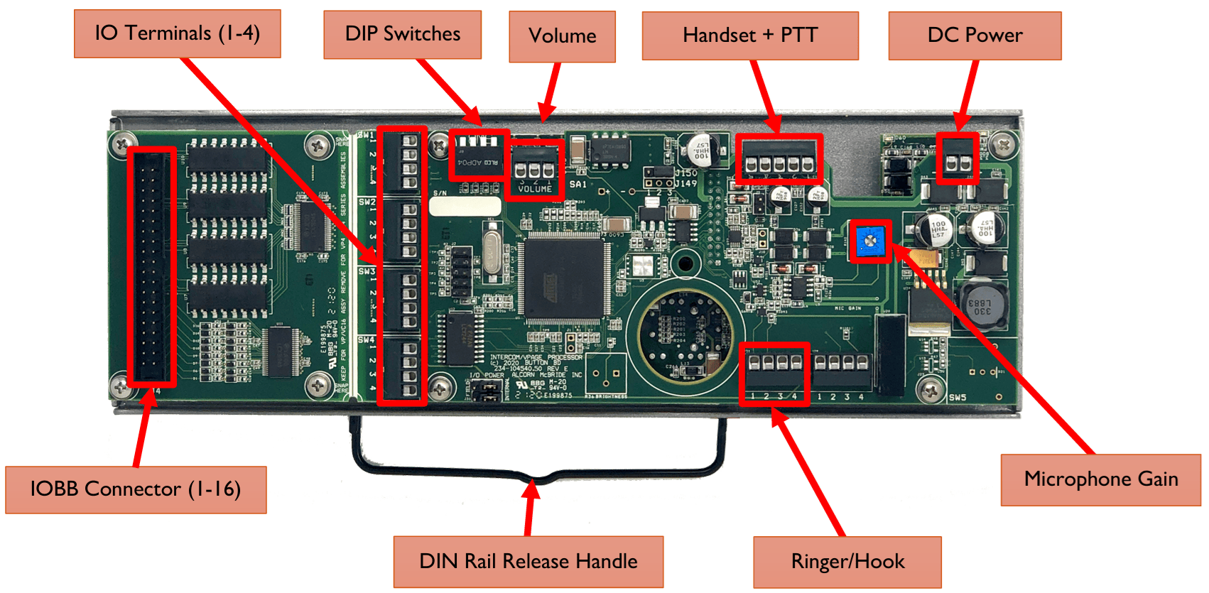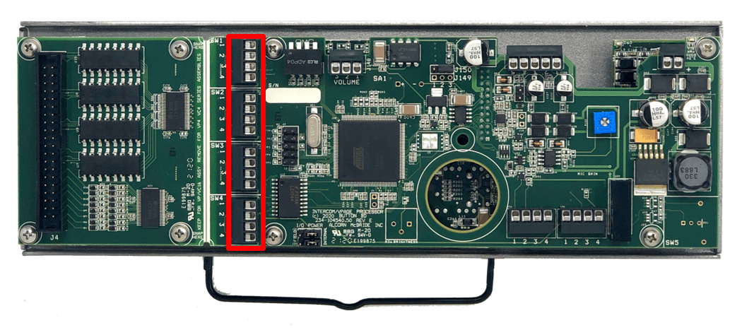 If your custom intercom station requires more than 4 buttons/indicators, you must use the included IOBB expansion interface that comes included with your VC16K intercom station kit. The Phoenix terminals of the IOBB make it easy to terminate your externally mounted pushbuttons and indicator lamps.