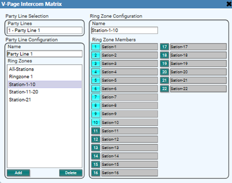 - Ring Zone Members: Assigns the selected stations to the currently selected ring zone. The station(s) that have a number light up will ring when that Ring Zone is called. The list will auto-populate from any station that has been assigned at the station plugin.