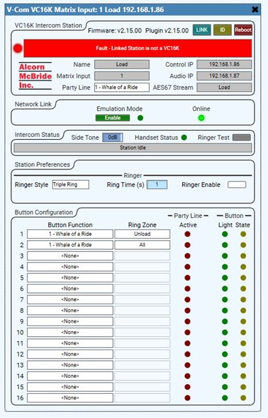 The V-Com Intercom Station plugin is used to configure all of the properties of a specific station, which are then transferred to the physical station when it is “Linked” to the Q-SYS Core.