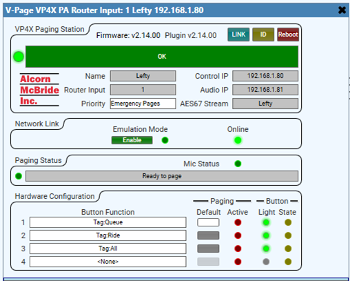 The V-Page communicates with a Q-SYS system to enable paging zones, determine zone priority, etc. This is accomplished using the built-in Q-SYS Zone PA Router. The V-Page can also be configured directly from within a Q-SYS plugin, and then transferred to the physical station when it is “Linked” to the Q-SYS Core.