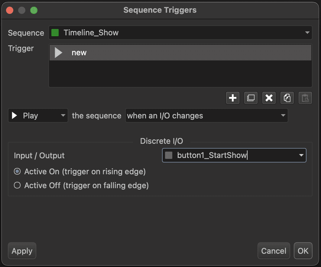 Click on the Plus(+) button to create the new trigger. Select Play the sequence when an IO changes, and then select button1_StartShow.