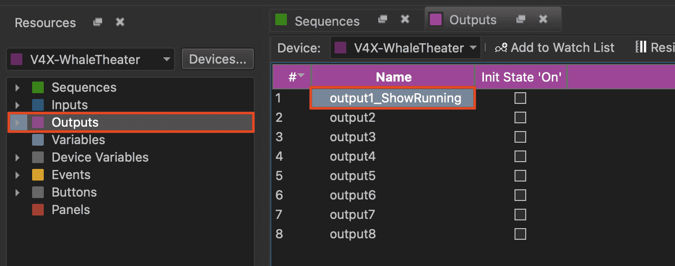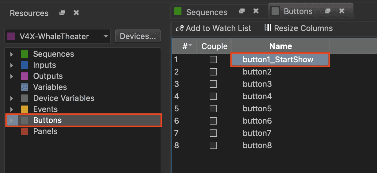 Double-click on the text button1 in the resource list and edit the contents to be button1_StartShow. This will assigned a more descriptive name to this button that we can use throughout the show control project.