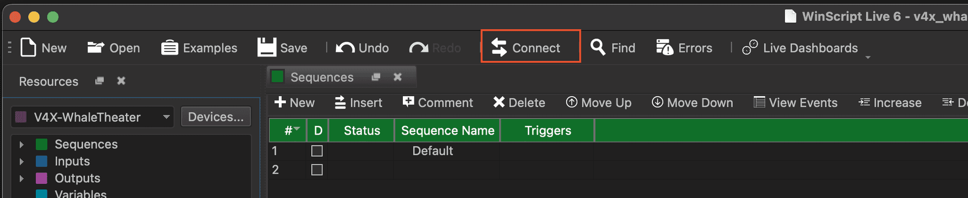 At this point, everything should be wired up, configured, and ready to go. The next step is to create a new script and then connect to the V4X using our WinScript Live software. Once connected, you will have access to configure and control the V4X unit.