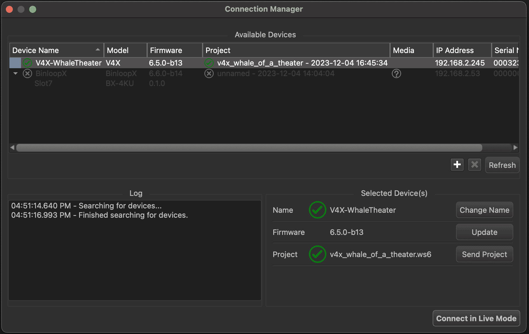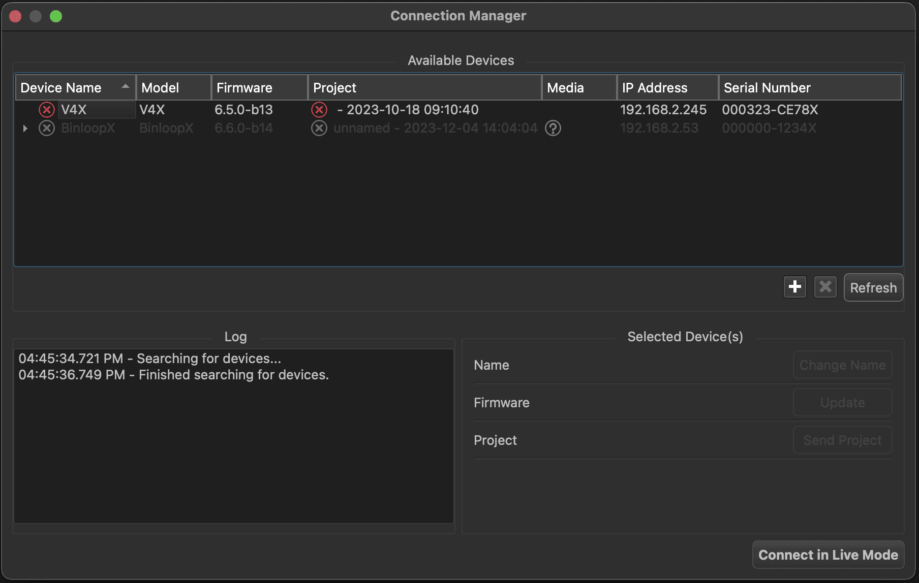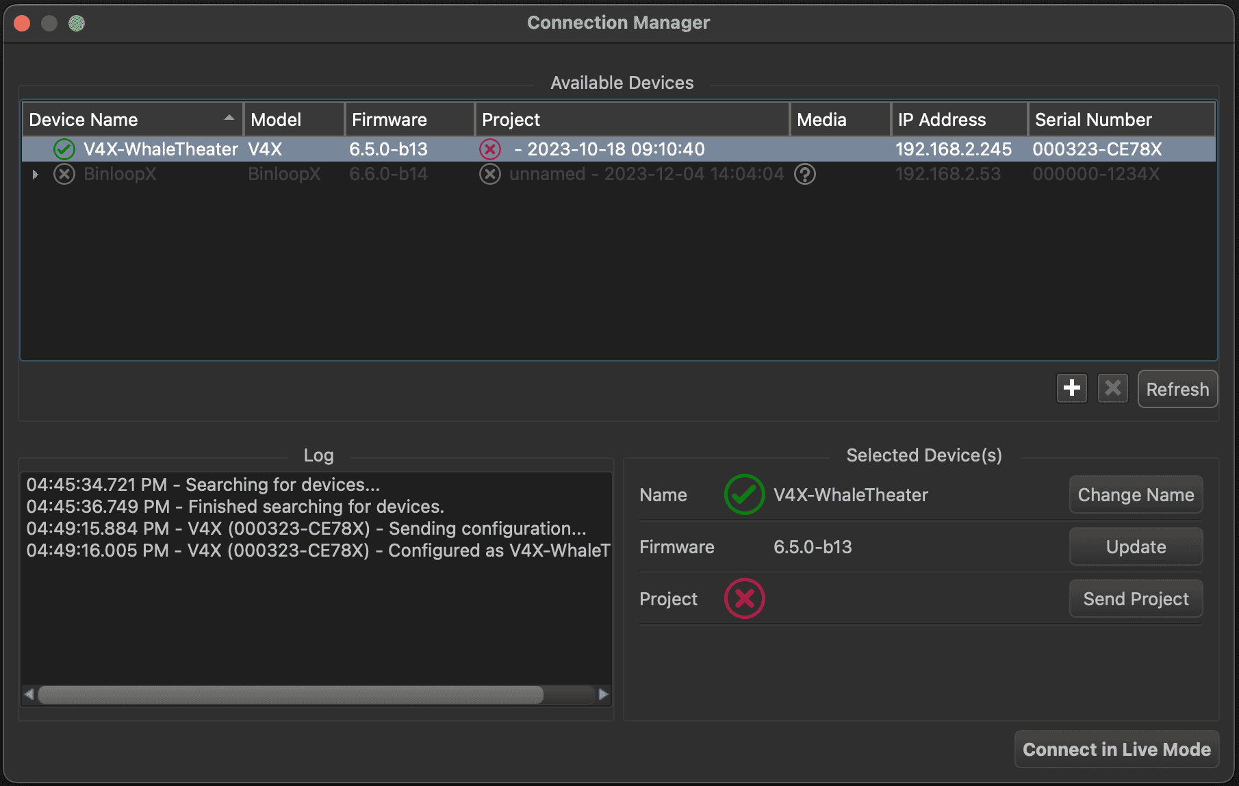 Click Connect in Live Mode to establish a live mode connection with the V4X. This will allow you to monitor and edit the V4X project in real time for the remainder of this Getting Started guide.