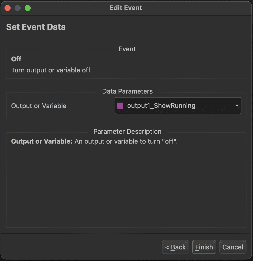 Select output1_ShowRunning as the output parameter, and then click the Finish button.