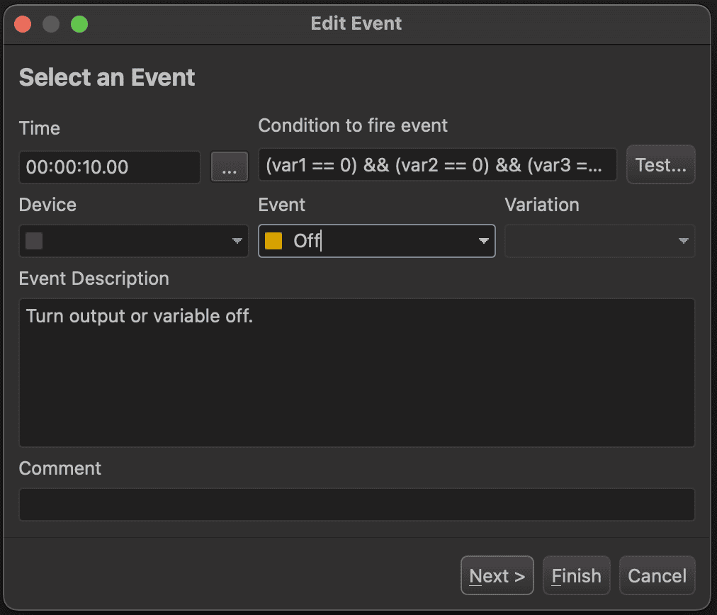 Add another event by clicking the New button at the top of the event list. This time, select Off as the event and enter a Time value of 00:00:10.00.
