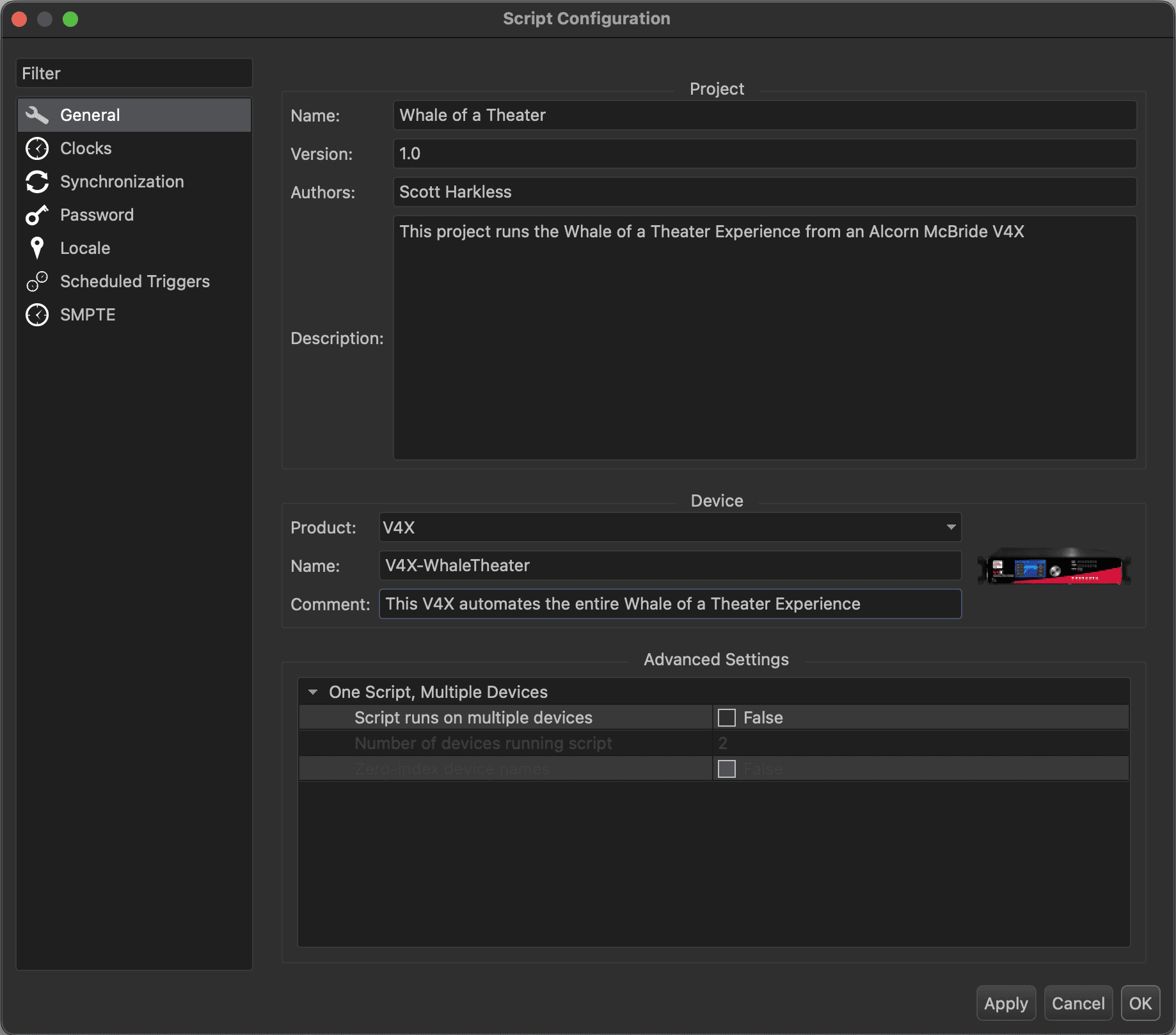 Select V4X as the Product and then enter a device Name in the properties below (i.e. V4X-WhaleTheater). Although it's not required, this is also a good opportunity to name your WinScript project file and add any comments that describe the purpose of this project and hardware. If you don't know the purpose, you should probably figure it out before the client realizes this and starts to wonder why they hired you.