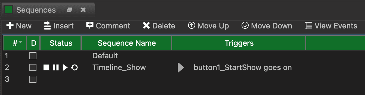 To add a new trigger, click on the sequence name Timeline_Show to select it and then click the Triggers button at the top of the Sequences view.