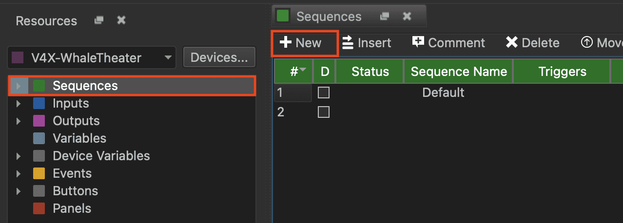 Add a new sequence by clicking the New button at the top of the sequence list.