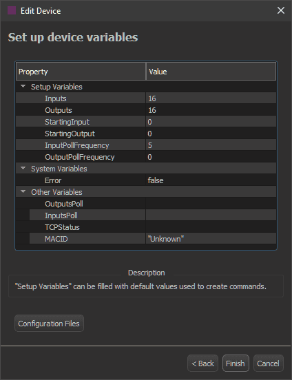 The variables you create in this wizard will automatically sync with the Modbus device at the configured addresses. Variables with read access will update in WinScript automatically on the interval specified in the "Poll Every" box. Variables with write access will cause a Modbus write command to be sent on the frame in which they are written in WinScript.