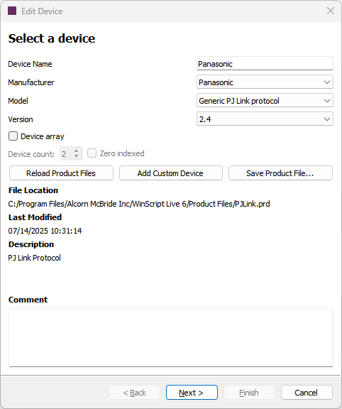 - Setup: If “True” specifies that this will appear in the device setup screen Comment: The comment that will appear in WinScript.