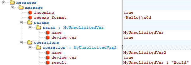 The below example shows an unsolicited message of "Hello" followed by a carriage return. This message shows storage in two different device variables.