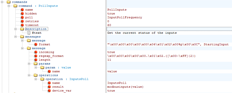 Note: the device variable "InputsPoll" is used so that the V16Pro will process the response. Without this "device_var" tag and variable, the function "modbusInputs()" would never be called.