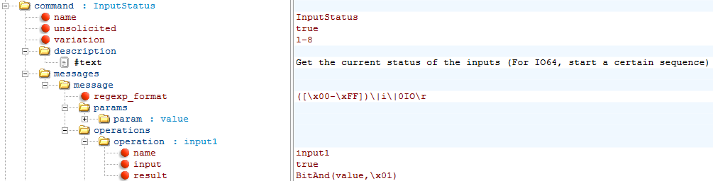 As an alternative to using "modbusinputs", any math operation (such as BitAnd()) may be used instead of the "modbusInputs()". To finally store the value in an individual Input, the parameter can have the attribute "Input" to note that this is the value that should be stored in the WinScriptLive Input. This method is used in the AMI_io64 product file (section shown below). In the IO64 product file, the responses are separate 'unsolicited messages' rather than a direct response to the "PollInputs" command.