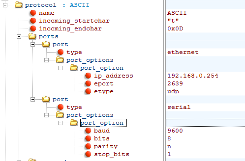 The details about each port are stored as a "port_option". If a device’s port uses multiple baud rates, add a "port option" for each baud rate configuration. In the case of ethernet, the IP address and UDP port is used only as a default parameter and not as a required connection IP.