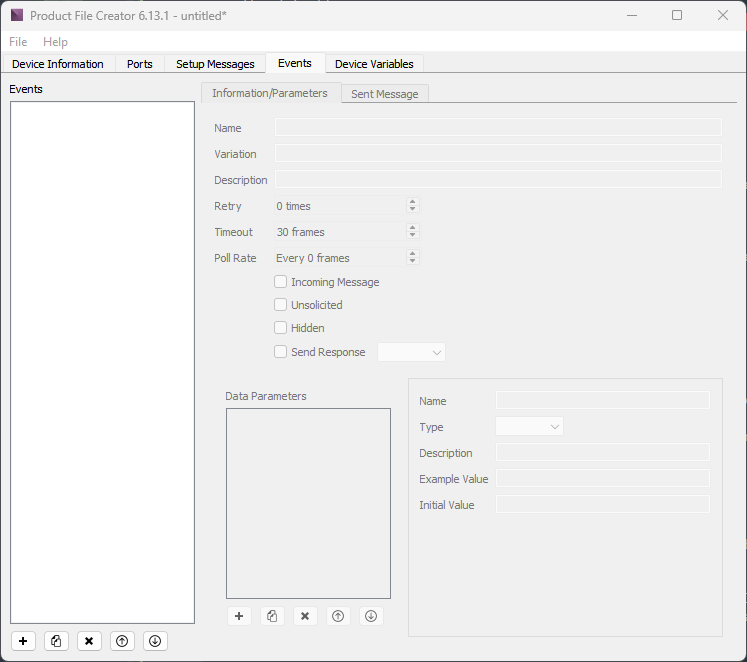 The Sent Message tab is used to define the message that is sent when the event is executed. Some of these messages are complicated combinations of Device Variables, data parameters, and even unprintable characters. For this reason, the Sent Message tab allows you to build a message as a combination of substrings.