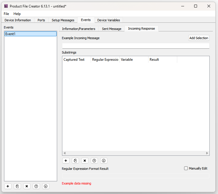 The area at the top near the label Example Incoming Message works like the Example Outgoing Message from the Sent Message tab. The white area labeled Substrings also works like the Substrings section of the Sent Message tab. Each Substring will have a Captured Text, Regular Expression, Variable, and Result. The Subtrings section can be resized for ease of use.