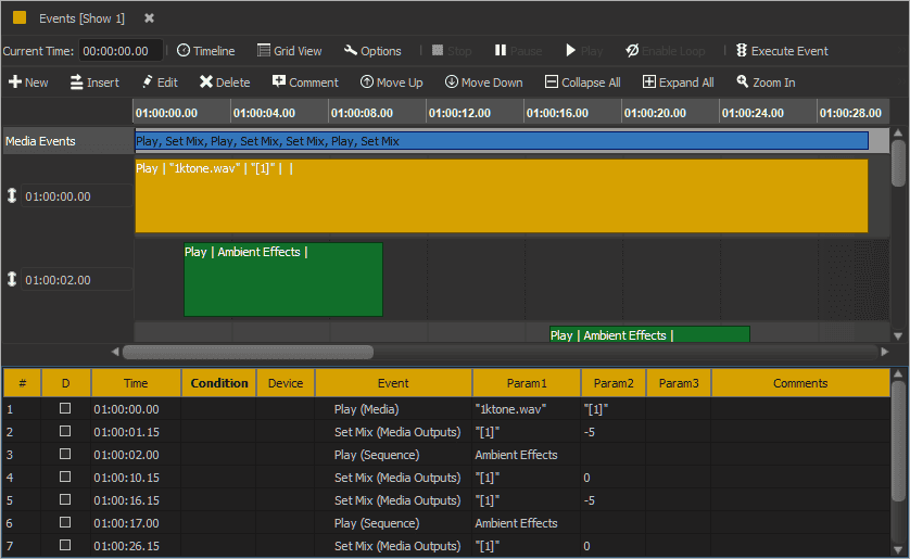 NOTE: This nesting behavior only applies to timed sequences. Sequences started from logical sequences are "freerunning." In other words, if logical sequence "C" contains a play event starting timed sequence "D," then there is no link between the two sequences. Pausing/stopping "C" does not affect "D" and pausing/stopping "D" does not affect "C."