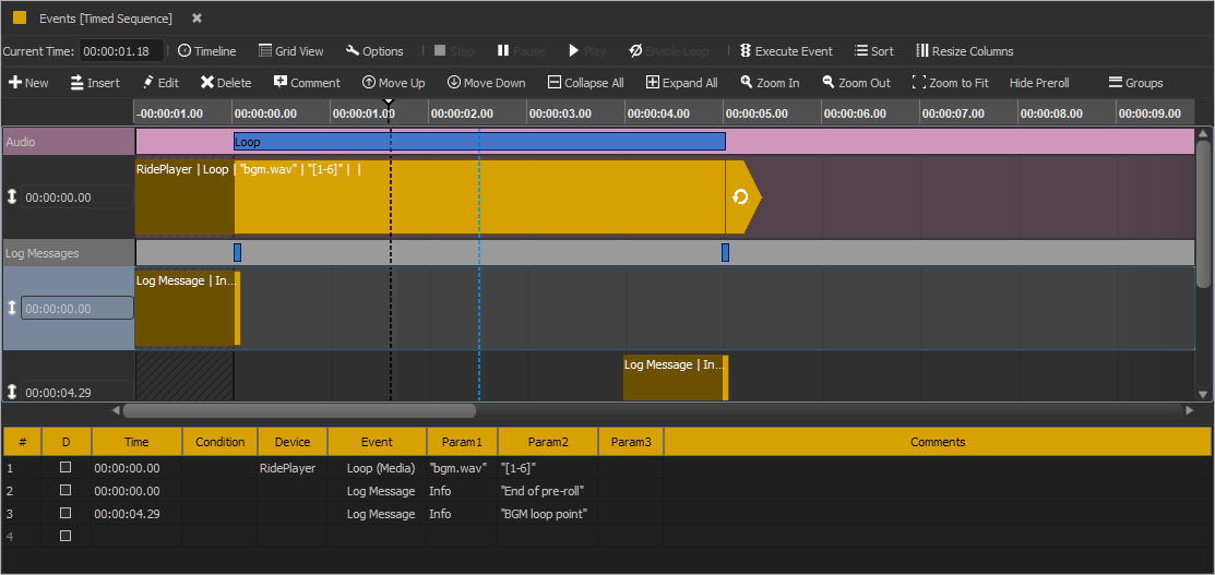 Timed sequences execute a series of events at a precise time, specified down to the frame. The events in a timed sequence can be viewed either as a grid, or as a visual timeline where events can be adjusted via drag-and-drop.