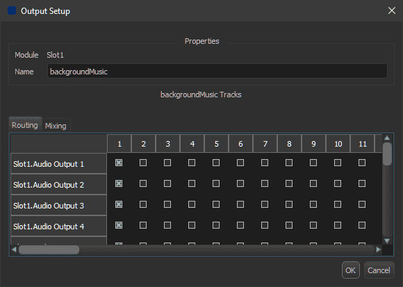 The player properties determines how each track is routed to each audio output including the default mix level. Double-click the desired row or select the row and click Edit to adjust the properties.
